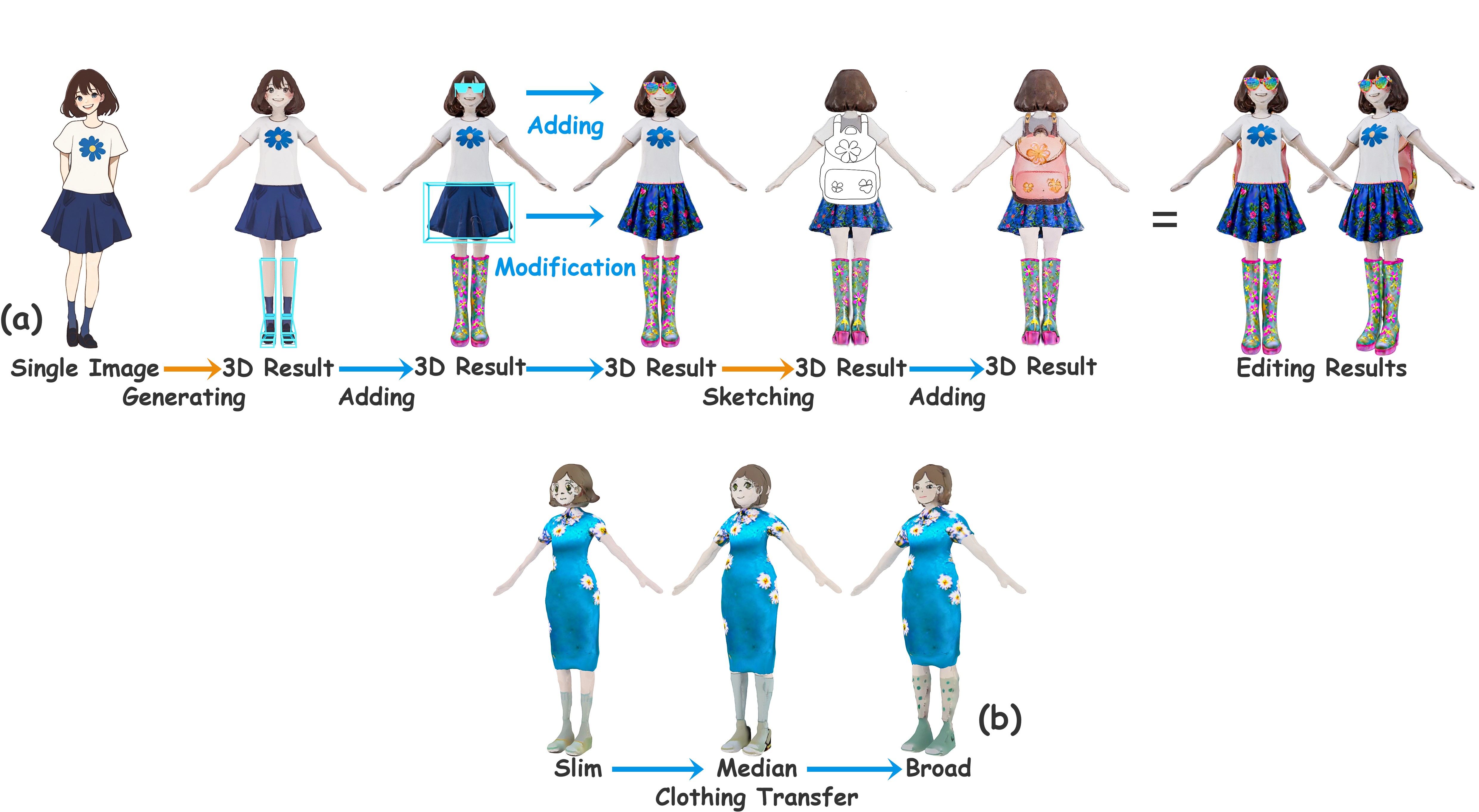 | This paper aims to controllably generate and edit layered 3D characters based on hand-drawing. To achieve controllable generation and part-level editing of high-quality 3D characters with changeable clothing, we propose an innovative layered 3D character generation and editing method based on sketches. |