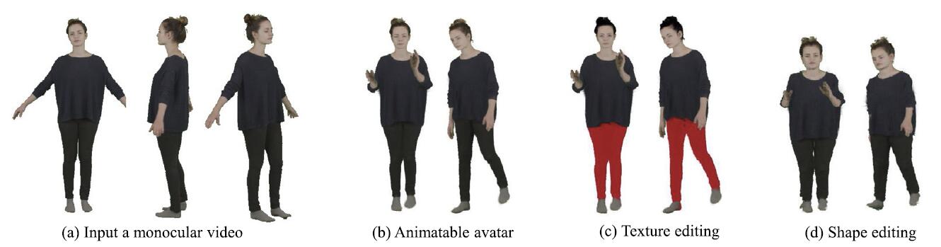 We propose a coarse-to-fine framework to reconstruct a personalized high-fidelity human avatar from a monocular video. Our framework also enables photo-realistic novel view/pose synthesis and shape editing applications. |