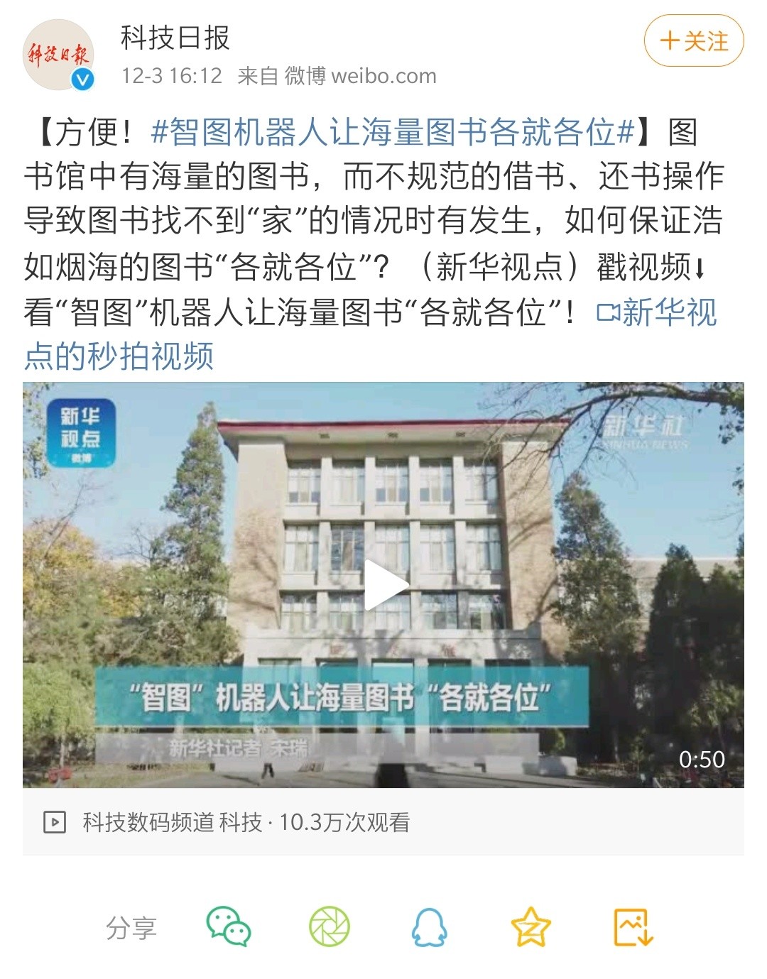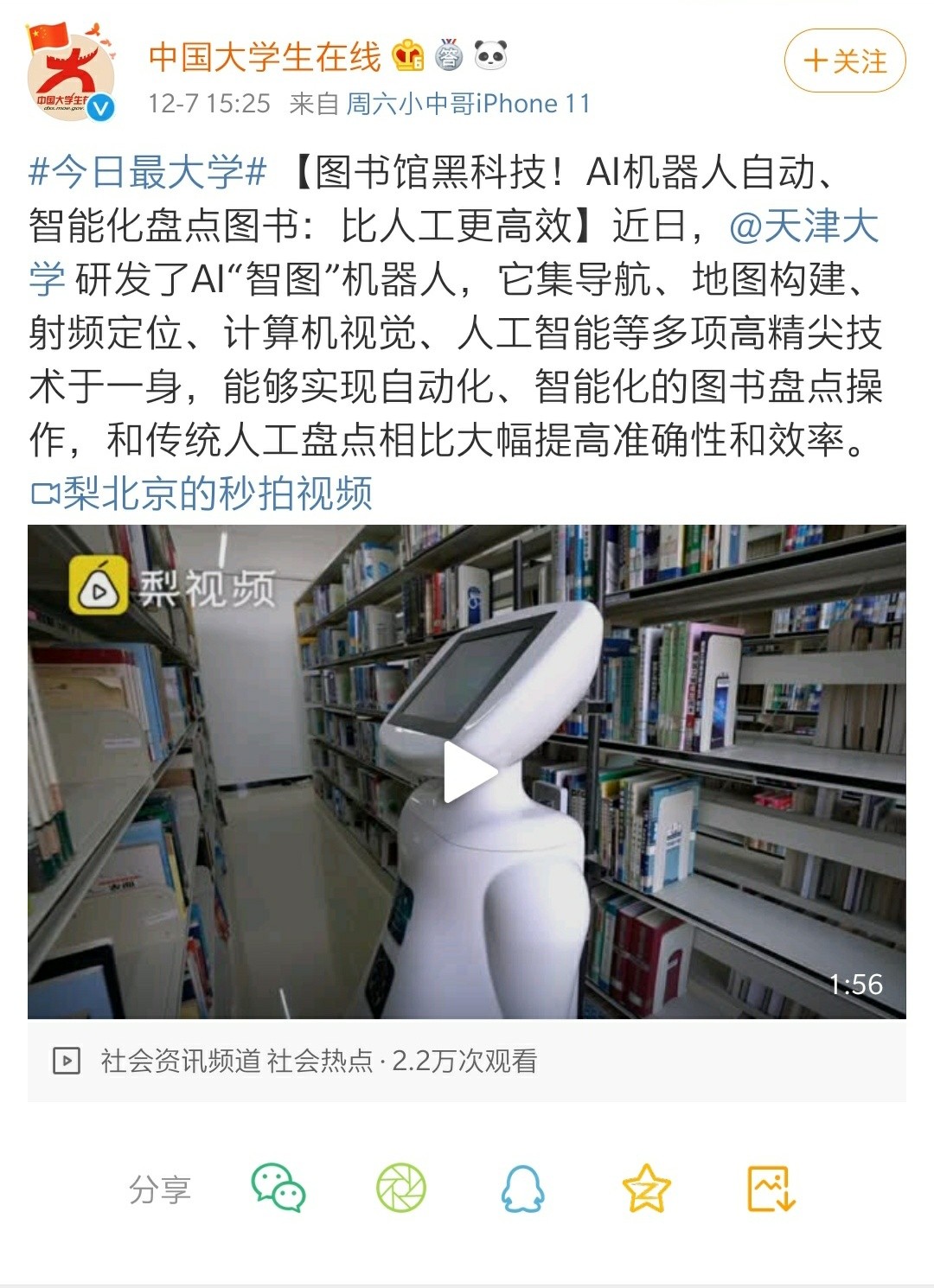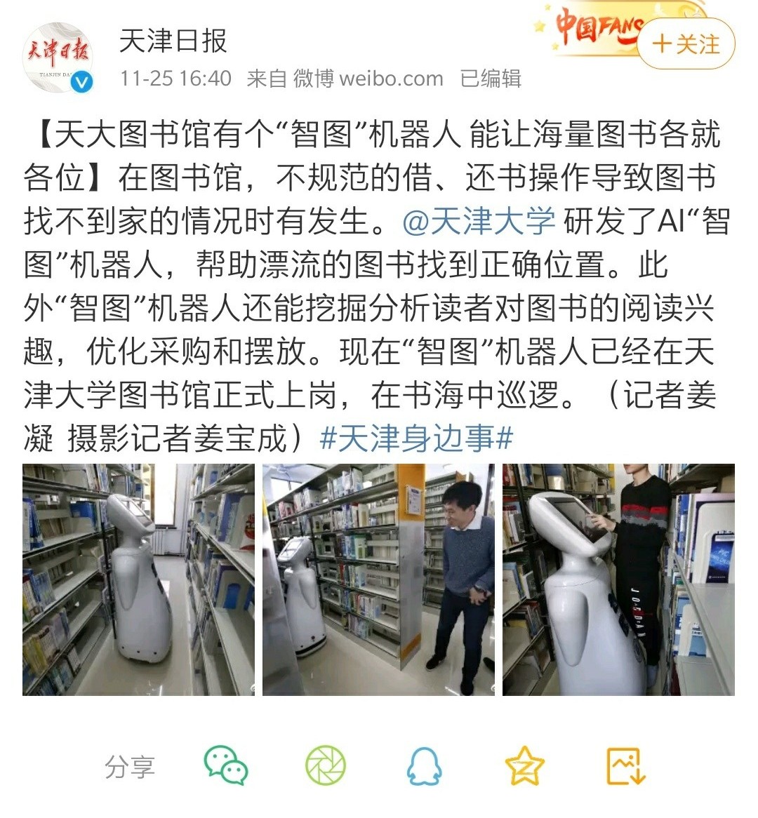 天津大学研发了AI“智图”机器人,帮助漂流的图书找到正确位置。此外“智图”机器人还能挖掘分析读者对图书的阅读兴趣,优化采购和摆放。