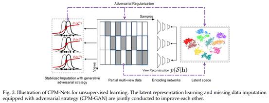 如Fig.2所示,在无监督条件下,通过引入对抗策略确保对缺失视图的补全合理性(提出min-max-min隐表示对抗学习框架),进一步确保完备表示有效性。