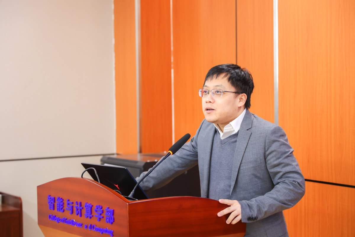 百度高校合作部总监李轩涯,百度高校合作部副总监计湘婷,智能与计算学部党委书记花建锋,智能与计算学部党委副书记赵娜,智能与计算学部副主任、人工智能学院院长胡清华,人工智能学院副院长王鑫等嘉宾出席签约仪式并发言。