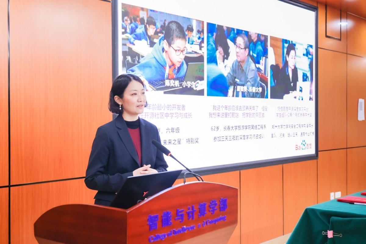 作为该项目的“班主任”之一,智能与计算学部杨柳老师介绍,本次百度松果学堂实践基地共有133名同学报名,在进行初筛之后进行了线上笔试,最终录取了116名同学,包括来自智能与计算学部、数学学院、自动化学院以及机械学院的同学们,遍布多个专业。学生代表也来到现场畅谈了自己加入百度松果学堂实践基地的感想,对百度和学校提供的丰富教育资源、学习和交流机会表达了感激和珍惜之情。