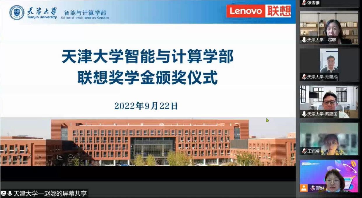 (通讯员 聂珍珍)2022年9月22日晚上,天津大学智能与计算学部举办“联想奖学金”线上颁奖仪式。联想研究院高校合作高级经理李跃华、人力资源业务伙伴(HRP)Lisa、创新孵化主管邢悦,天津大学智能与计算学部党委书记魏建国、党委副书记赵娜、学生工作办公室主任赵义等领导老师,以及全体获奖学生和部分对联想集团感兴趣的同学参加了本次颁奖仪式。
