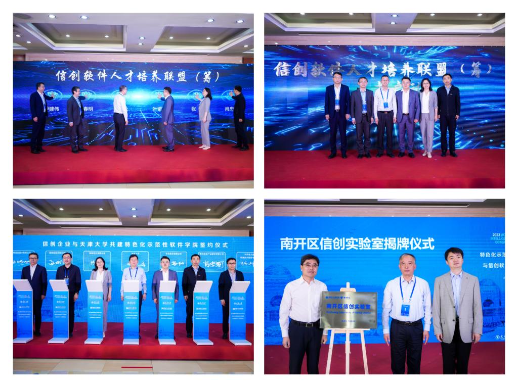 华为技术有限公司、曙光信息产业股份有限公司、麒麟软件有限公司、飞腾信息技术有限公司、国家超级计算天津中心、天津南大通用数据技术股份有限公司等六家信创企业与天津大学签署了进一步共建天津大学特色化示范性软件学院的协议,在多年深入合作的基础上拓宽合作范围,优化校企合作模式,为信创领域核心技术协同攻关、高质量信创软件人才培养提供更为坚实有效的支撑。天津市南开区人民政府联合天津大学智能与计算学部、中国电信集团天津分公司签署了共建“南开区信创实验室”的合作协议并揭牌,该实验室将为天津大学特色化示范性软件学院人才培养提供创新创业、实习实训的资源与环境。
