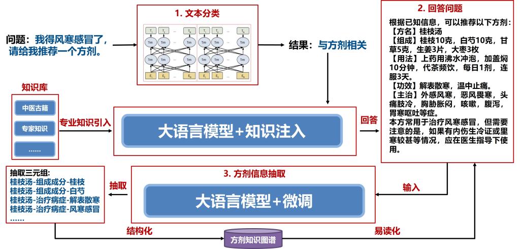 该系统利用大语言模型和知识图谱等人工智能新技术,实现中医药专业知识的智能问答,能够根据用户描述的症状进行中医药方剂智能推荐,形成中医药专业知识智能专家系统,由智能与计算学部人工智能学院副院长王鑫教授负责的数据库实验室研发。