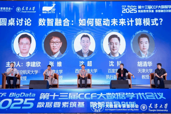 圆桌讨论环节由北京航空航天大学李建欣教授主持,论坛特邀天津大学张维教授、西安交通大学沈超教授、百度集团执行副总裁沈抖博士,天津大学胡清华教授和与会者展开深度交流。各位专家结合自身研究与实践经验,以“数智融合:如何驱动未来计算模式?“为主题,探讨了未来计算模式的发展路径、技术挑战与创新机遇等。随后各位专家对现场师生提问作出了深入而详实的回应。他们的见解不仅拓宽了学术视野,也激发了与会学者对智能信息系统演进方向的多元思考,为未来研究与应用提供了富有建设性的启发。