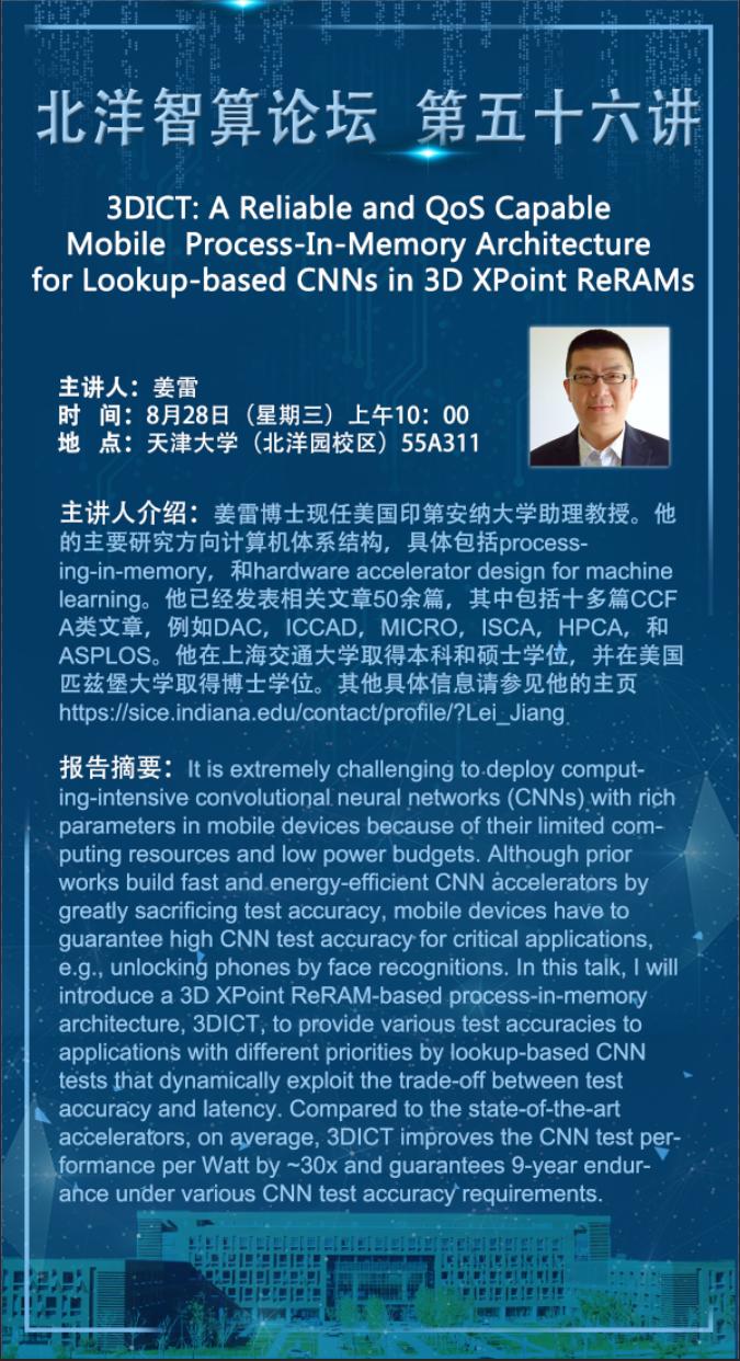 姜雷博士现任美国印第安纳大学助理教授。他的主要研究方向计算机体系结构,具体包括processing-in-memory,和hardware accelerator design for machine learning。他已经发表相关文章50余篇,其中包括十多篇CCF A类文章,例如DAC,ICCAD,MICRO,ISCA,HPCA,和ASPLOS。他在上海交通大学取得本科和硕士学位,并在美国匹兹堡大学取得博士学位。