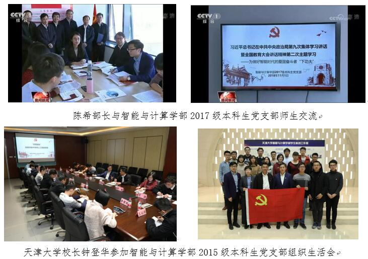 2018年11月1日,中共中央政治局委员、中组部部长陈希在天津大学图书馆党的理论和党史党建学习区,与智能与计算学部2017级本科生党支部师生交流理论学习情况,鼓励学部师生潜心钻研、学深学透、知行合一。2018年12月24日,天津大学校长钟登华全程参加智能与计算学部2015级本科生党支部“学思践悟——改革开放四十周年与人工智能发展”为主题的组织生活会并讲话。
