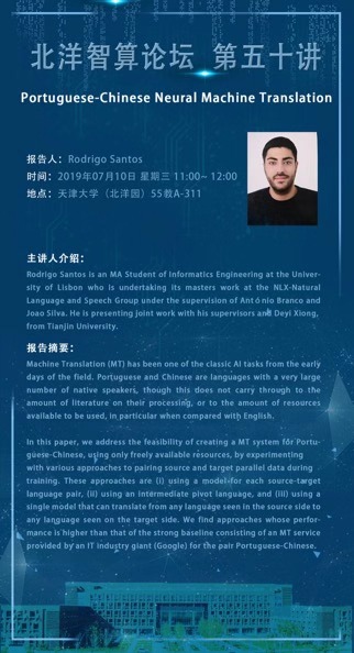 Rodrigo Santos is an MA Student of Informatics Engineering at the University of Lisbon who is undertaking its masters work at the NLX-Natural Language and Speech Group under the supervision of António Branco and João Silva. He is presenting joint work with his supervisors and Deyi Xiong, from Tianjin University.