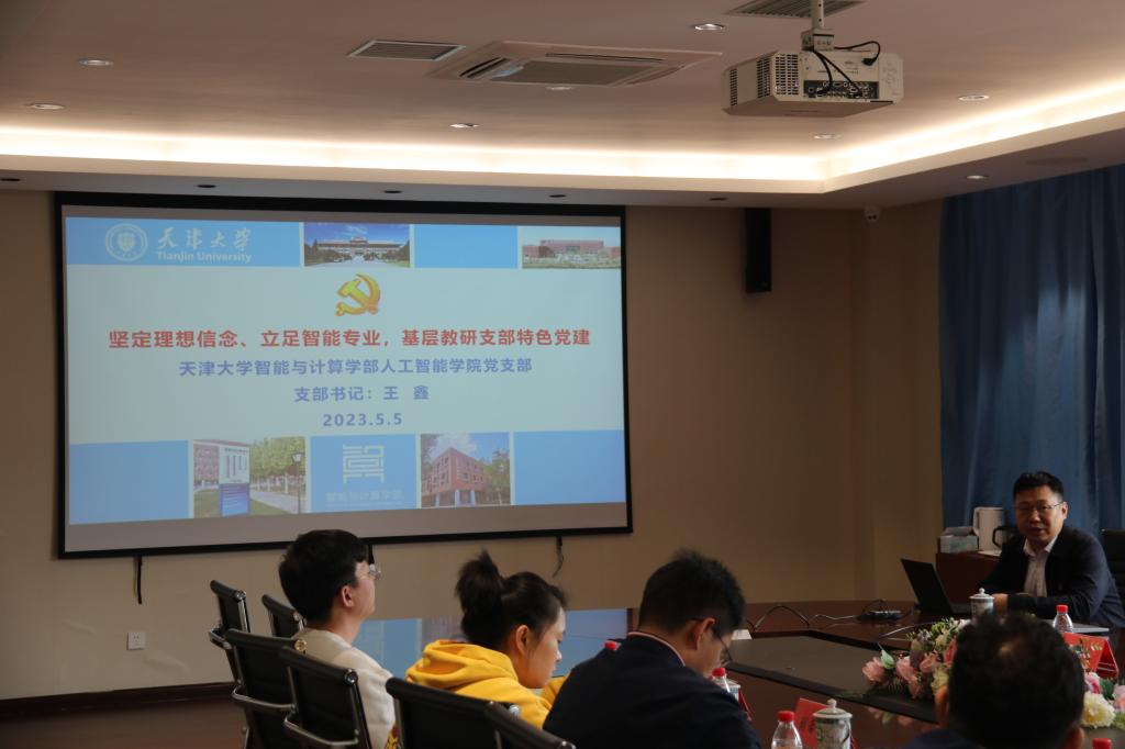 天津大学智能与计算学部人工智能学院党支部书记、副院长王鑫同志介绍了天津大学智能与计算学部人工智能学院党支部的基本情况、组织生活、党日活动以及一些特色主题活动,包括市长讲党课、基金打磨会、师生见面会、建设党史知识图谱等,并现场展示了用AI技术完成的党史知识图谱这一创新成果,充分体现出了将党员学习教育与人工智能专业结合,理论联系实际,切实发挥出了高校教工党支部坚实战斗堡垒的作用。此外王鑫同志还对天津大学智能与计算学部的人工智能专业人才培养课程体系进行了详细的介绍。