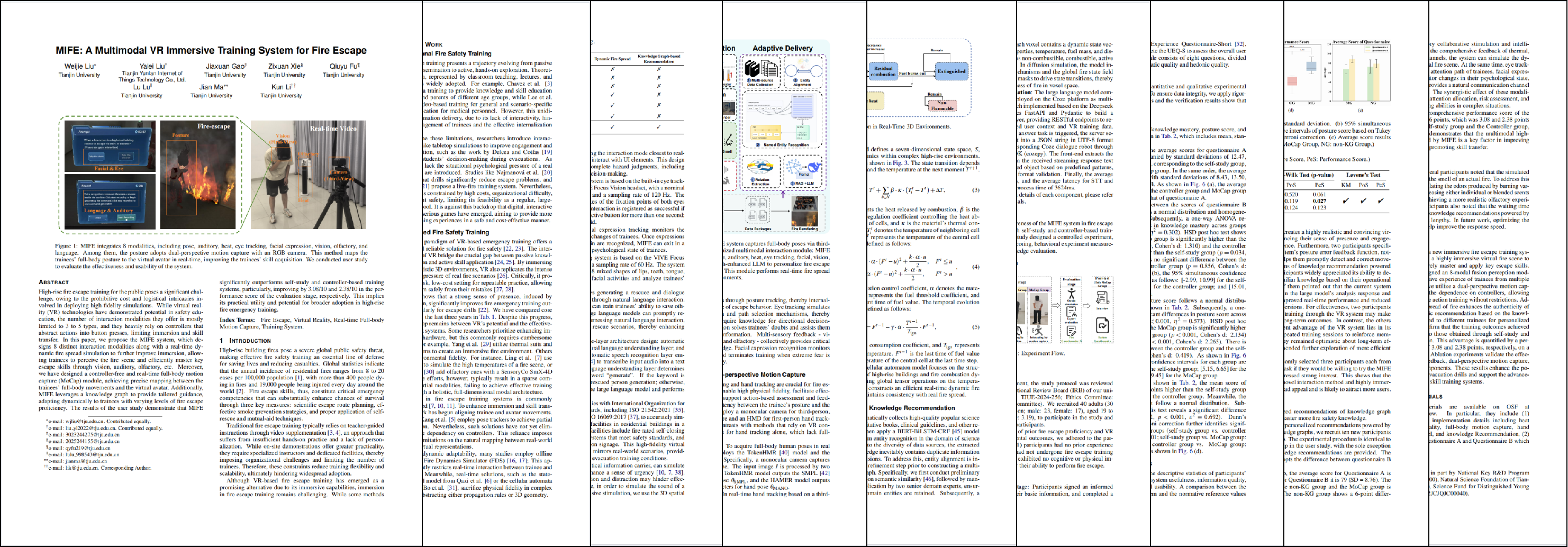 Weijie Liu, Yalei Liu, Jiaxuan Gao, Zixuan Xie, Qiuyu Fu, Lu Lu, Jian Ma, Kun Li. "MIFE: A Multimodal VR Immersive Training System for Fire Escape". 2026 IEEE Conference on Virtual Reality and 3D User Interfaces (IEEE VR), 2026.