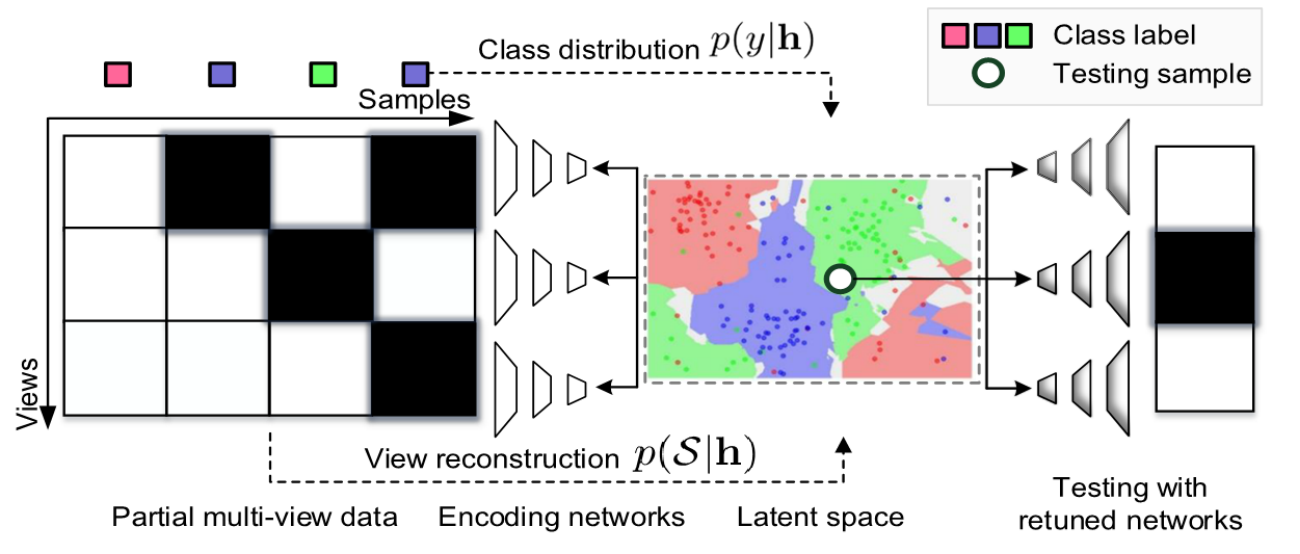该成果延续了机器学习与数据挖掘团队在异构多源信息融合方面的系列工作,提出了存在缺失数据情况时的深度编码及分类模型:Cross Partial Multi-View Networks (CPM-Nets)。该模型充分利用完备信息编码的灵活性,直接处理严重缺失的数据,突破了传统模型对缺失数据丢弃或者补全等干预方式,实现了算法层面的高度自适应。为了使得模型既能够适应大规模训练数据也可兼容小样本学习任务,作者设计了一种结构化分类器,达到“深层网络挖掘多源信息复杂关联,浅层结构化损失正则完备表示”。并为多源信息融合方法建立了严格的理论基础,从而为多源信息融合效果提供了理论保证。