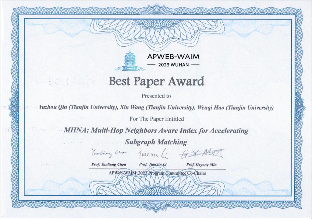 (通讯员 秦雨舟)第7届APWeb-WAIM Web与大数据联合国际学术会议(The 7th APWeb-WAIM Joint Conference on Web and Big Data)于10月6日至8日在中国武汉召开,智能与计算学部2021级硕士研究生秦雨舟的论文“MHNA: Multi-Hop Neighbors Aware Index for Accelerating Subgraph Matching”荣获本次会议的最佳论文奖(Best Paper Award),论文指导教师为王鑫教授。