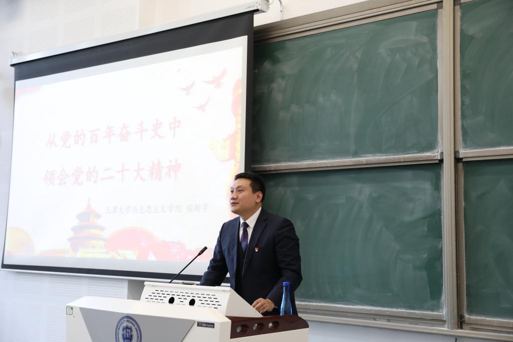 第二天的培训邀请了马克思主义学院副教授程斯宇做题为《从党的百年奋斗史中领会党的二十大精神》的报告。程老师从中国共产党历史研习的相关基本问题、中国共产党百年奋斗历程、中国共产党百年奋斗的历史意义及经验三个方面解读了党的二十大精神,深刻阐述了习近平新时代中国特色社会主义思想的要点及精神实质,并为大家学习党的理论体系给出了方法上的指导,参会党员收获颇丰。