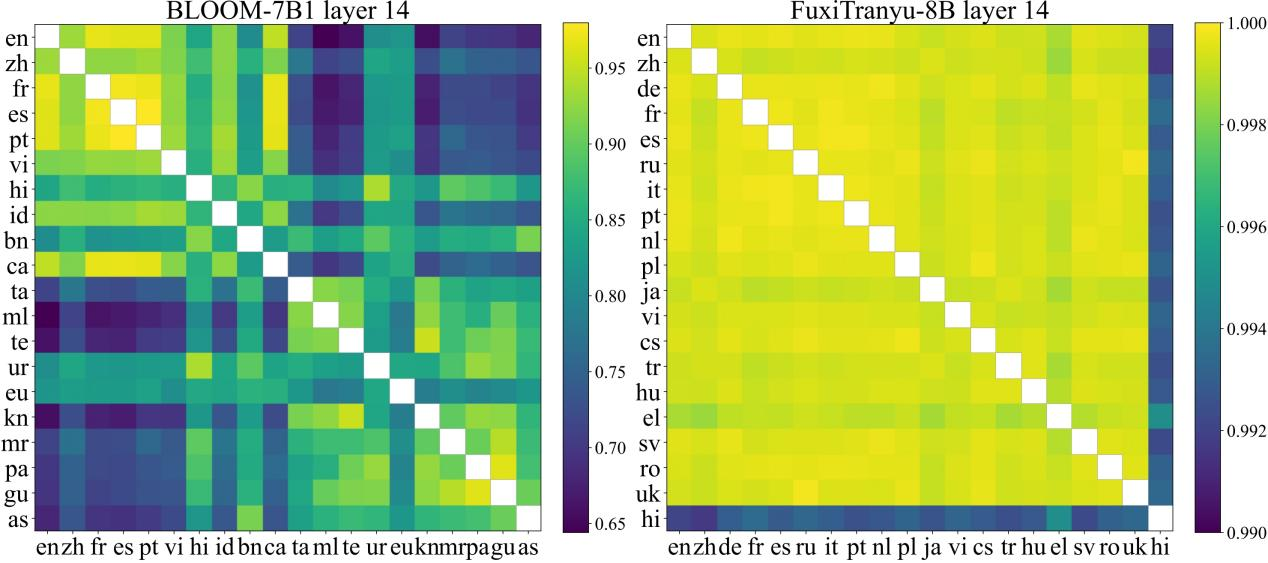 图2 FuxiTranyu与BLOOM多语言学习内部表征相似性