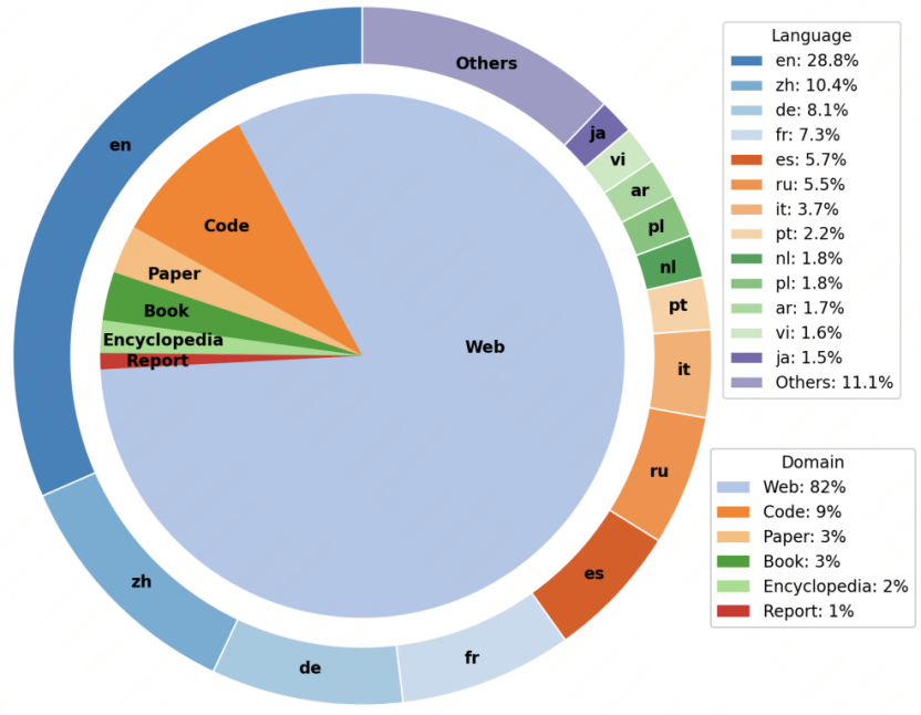 伏羲传语大模型支持“一带一路”沿线、亚洲及欧洲多个国家的官方语言,合计43种,包括汉语、英语、阿拉伯语、葡萄牙语等富资源语言,以及孟加拉语、缅甸语、泰米尔语等低资源语言,覆盖汉藏语系、印欧语系、亚非语系等10大语系。除此之外,伏羲传语还支持C++、Java、C、C#、Python等16种编程语言。预训练数据来源涵盖互联网、书籍、论文、百科、代码数据。此次预训练使用了研发团队收集的28万亿词元数据中的6060亿词元数据。