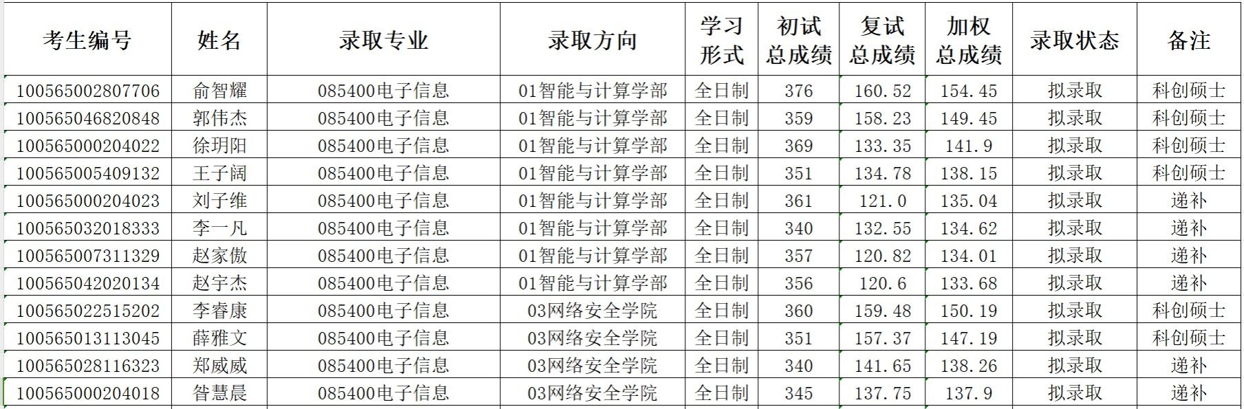 另,经考核,085400电子信息(01智能与计算学部方向)有4名同学经过宣怀学院科创综合面试,考核合格,拟录取为科创硕士;085400电子信息(03网络安全学院方向)有2名同学经过宣怀学院科创综合面试,考核合格,拟录取为科创硕士。根据学校、双方学院招生工作整体安排,在我学部电子信息(085400)上述两个方向分别增加招生名额4名及2名,按照总成绩由高到低顺次拟录取。