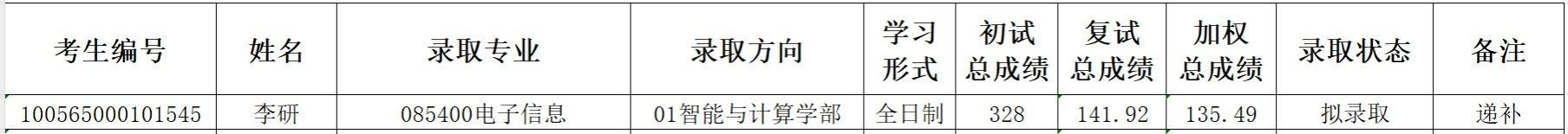 我学部工学硕士专业081200计算机科学与技术合格生源不足,经学校核准,从085400电子信息(01智算学部方向)未录取生源中,依照加权总成绩顺次录取1名考生。