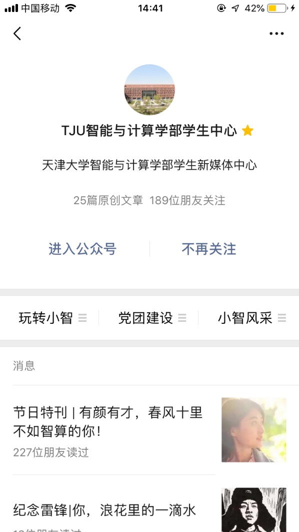 社团充分运用新媒体集群效用,全力打造“TJU智能与计算学部学生中心”微信公众平台,以“聚焦思想引领,聚焦文化传播,聚焦学生关切”为原则,搭建网上思政教育平台。每日精心选题,服务学生学习生活,发文内容涵盖优秀学子专访、校园攻略、通知通告、党团活动新闻、成长励志等,并开设每周活动预告、上周新闻回顾栏目。全方位覆盖校园生活、工作学习、社团活动等多方面的信息资讯,将习近平新时代中国特色社会主义思想融入到网络思想政治教育中去。成为学部师生获取消息、关注校园文化的重要平台之一,也成为学部宣传十九大精神,开展思想引领的主阵地之一。