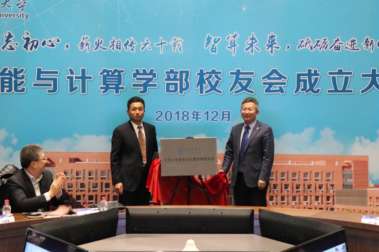 天津大学校友总会秘书长、校友与基金事务处处长潘峰和新任会长、学部党委书记花建锋为学部校友会揭牌。