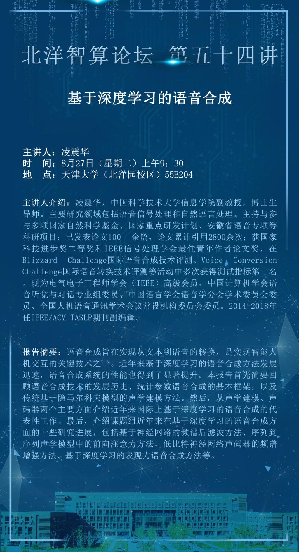 凌震华:中国科学技术大学信息学院副教授,博士生导师。主要研究领域包括语音信号处理和自然语言处理。主持与参与多项国家自然科学基金、国家重点研发计划、安徽省语音专项等科研项目;已发表论文100 余篇,论文累计引用2800余次;获国家科技进步奖二等奖和IEEE信号处理学会最佳青年作者论文奖,在Blizzard Challenge国际语音合成技术评测、Voice Conversion Challenge国际语音转换技术评测等活动中多次获得测试指标第一名。现为电气电子工程师学会(IEEE)高级会员、中国计算机学会语音听觉与对话专业组委员、中国语言学会语音学分会学术委员会委员、全国人机语音通讯学术会议常设机构委员会委员。2014-2018年任IEEE/ACM TASLP期刊副编辑。