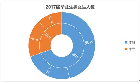 我院2017届毕业生中共有男生146人,占毕业生总人数64%。女生81人,占毕业生总人数36%。男女比例约为1.8:1。其中本科生男女比例约为2:1,硕士生男女比例约为1.5:1。