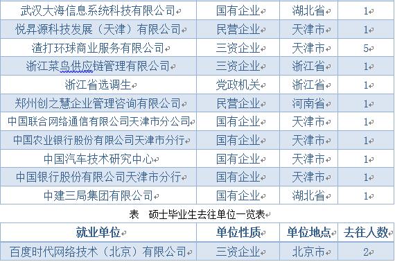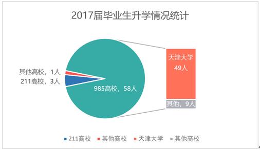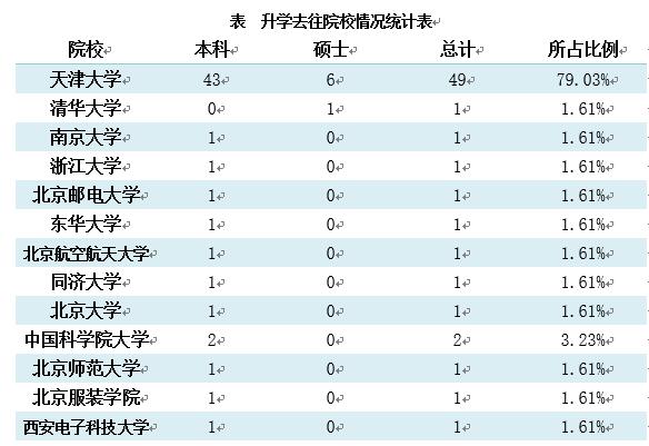 升学到天津大学的人数共49人,占总国(境)内升学人数的79.03%。毕业生在国(境)内高校深造情况如下表所示;