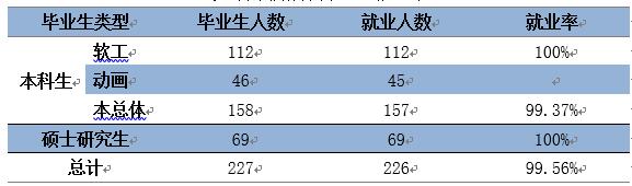 天津大学软件学院2017届毕业生共227人。其中本科生158人,占毕业生总人数69.6%(软件工程专业112人,占本科毕业生70.89%。动画专业46人,占本科生毕业生29.11%)。硕士研究生69人,占毕业生总人数30.4%。