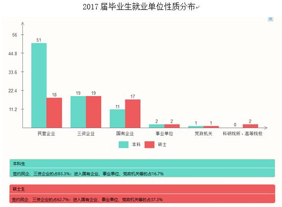 本科生,签约民营企业的为51人,占本科就业总人数的60.71%;签约国有企业的11人,占13.1%;签约三资企业的19人,占22.62%;签约事业单位、党政机关的共计3人,占3.57%。