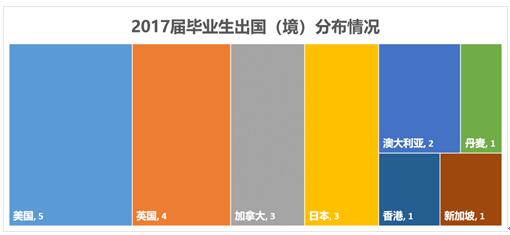 2017届毕业生中,选择出国(境)继续深造的毕业生人数为20人。其中本科生18人,占本科生总毕业生人数的12.7%;硕士研究生2人,占硕士总毕业人数的2.9%。2017届毕业生出国(境)继续深造的高校具体情况如下表所示: