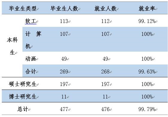本学部2018届毕业生中,以各种形式直接就业的共有341人。其中21人自由职业(软件工程7人,动画14人)。本科生145人,占本科生总毕业人数的53.9%;硕士研究生187人,占硕士生总毕业生人数的94.9%;博士研究生9人,占博士生总毕业生人数的81.8%。