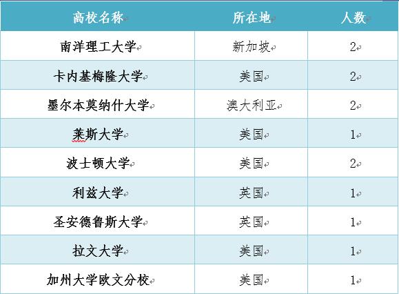 如上表,智能与计算学部2018届毕业生去往美国18人,英国2人,新加坡2人,澳大利亚2人,日本1人。