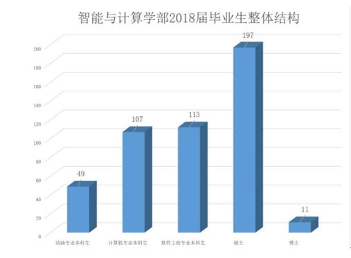 天津大学智能与计算学部2018毕业生共477人。本科生269人,硕士研究生197人,博士研究生11人。其中本科生分三个专业,计算机科学与技术107人,软件工程113人,动画49人。硕士专业为计算机科学与技术、计算机技术、软件工程、模式识别与智能系统,以上专业在实际就业过程中专业区分度不大,故作整体分析。